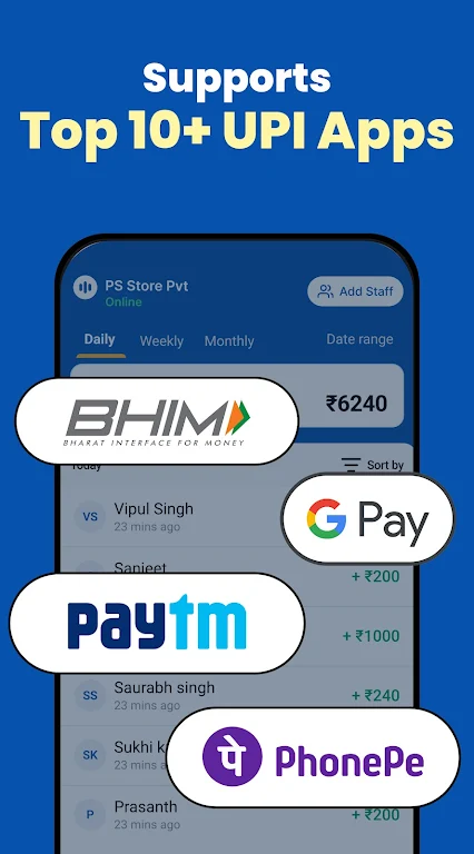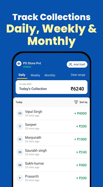 Check daily, weekly, and monthly payment summaries on a clean, user-friendly dashboard — perfect for cash flow and business tracking.