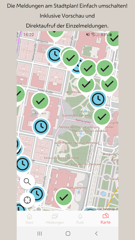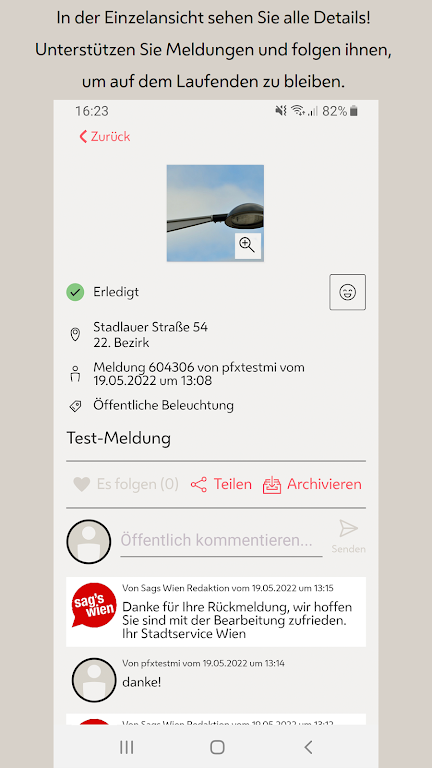 Track and manage reports with ease using list view, city map view, or detailed displays. Support other users’ reports, follow updates, and receive real-time push notifications as the city processes your request—making Sag’s Wien a trusted city issue reporting app and public service app for Vienna.
