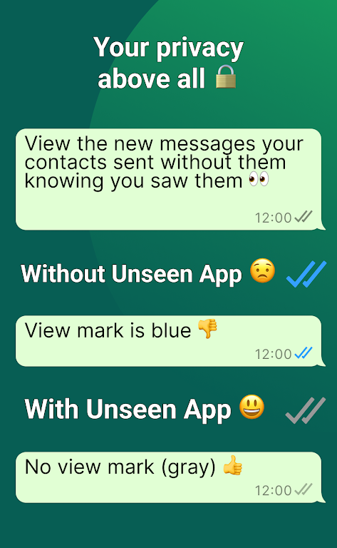 Ever wish you could read messages without notifying the sender? With Unseen, you can view texts, photos, videos, voice notes, and other media in complete privacy. No more worrying about appearing online or feeling pressured to reply right away! This app gives you total control over your messaging experience.