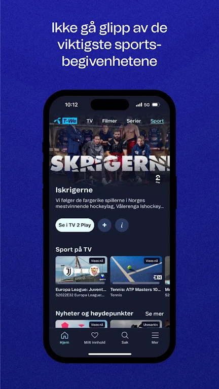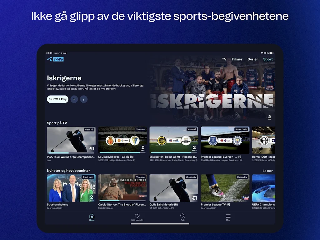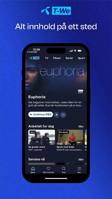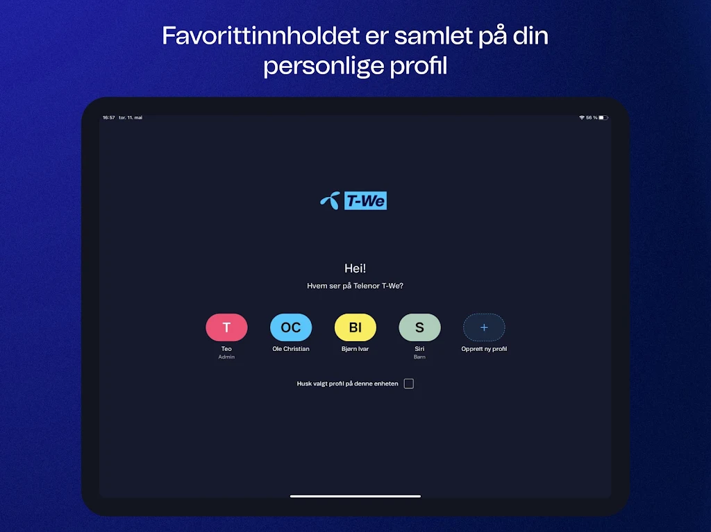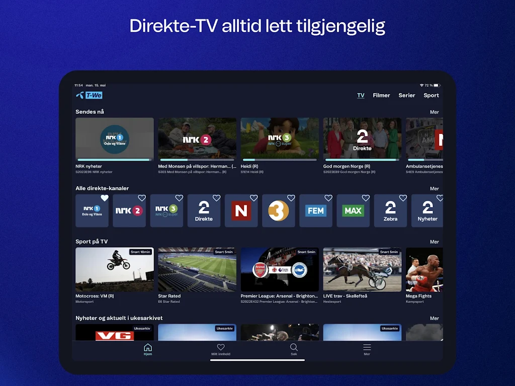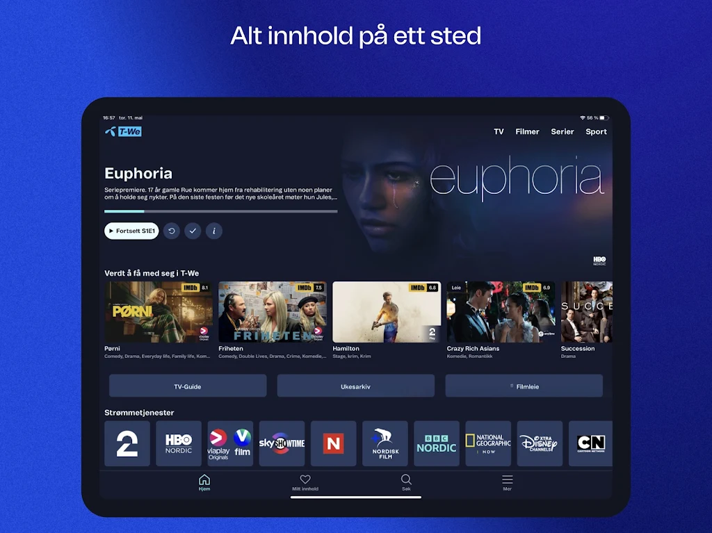 With the T-We App included in your T-We subscription from Telenor, you can watch TV, movies and series exactly when it fits your day—at home, in the cabin or on the move. Enjoy instant access on Apple TV, mobile or tablet, complete with intuitive navigation and fast streaming performance.
