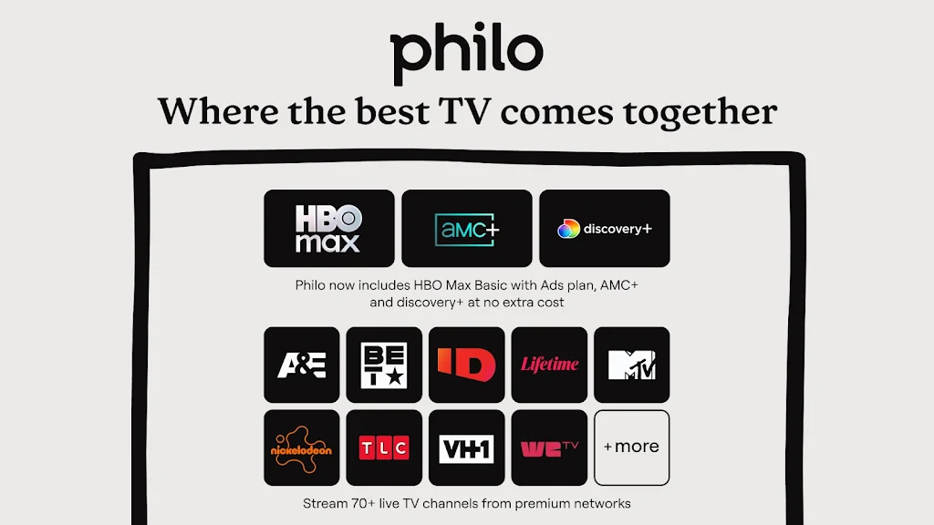 Philo brings together the best TV content in one easy-to-use subscription. Stream your favorite networks like AMC, BET, MTV, Nickelodeon, and more, or dive into a massive library of 85,000+ movies and shows. Plus, enjoy fan-favorite series from AMC+, discover captivating content with discovery+, and access HBO Max—all with a single subscription!