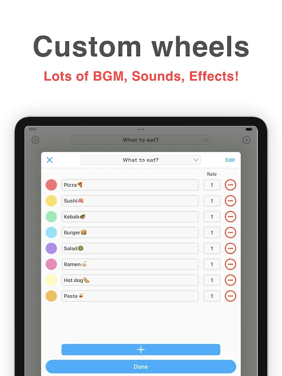 Wheel+ is an enhanced, user-friendly version of the classic roulette of luck. Packed with customizable options, vibrant sounds, and endless fun, this app makes your daily decisions a lot more enjoyable. With a variety of features like a secure password lock and background music, you’ll never get bored. Say goodbye to indecisiveness and start spinning your way to fun today!