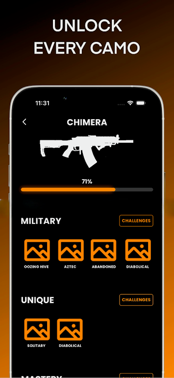 Track your camo progress effortlessly and plan your strategy across different game modes. With a clear overview of your challenges and rewards, you'll know exactly what to focus on. Whether you’re aiming for that final camo or just want to track your progress, this app keeps everything organized and easy to access. Enjoy the convenience of having all your camo challenges in one place, and stay ahead of the competition!