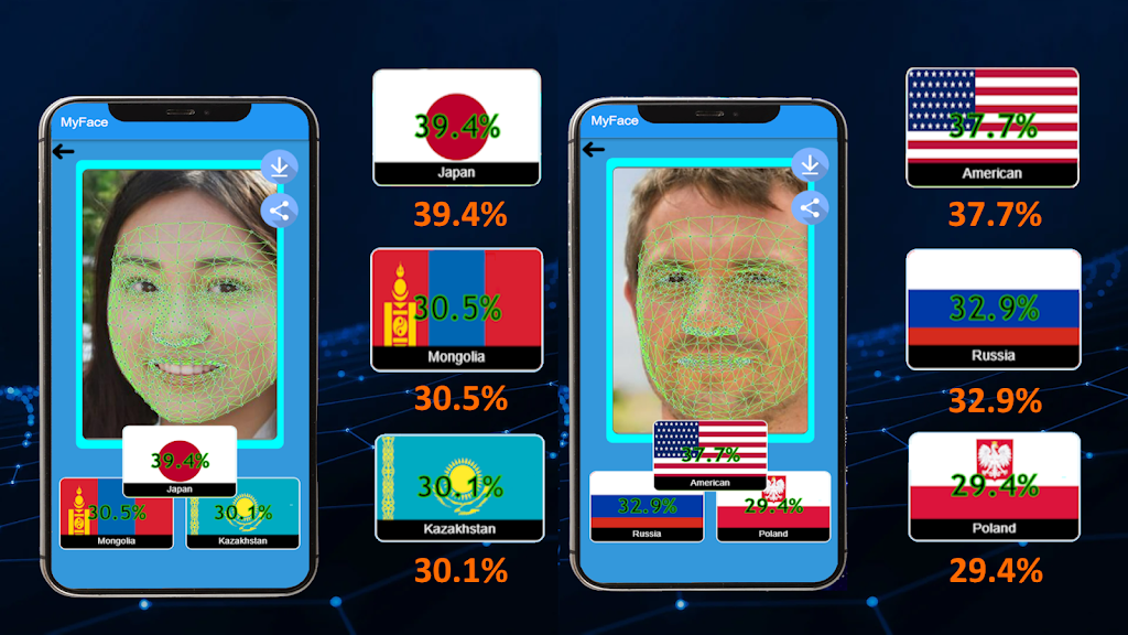 Curious about your ethnic roots or want to see a breakdown of your ancestry? MyFace makes it easy and fast to learn more about your national identity. Whether you're just having fun or exploring your heritage, the results are quick and accurate.