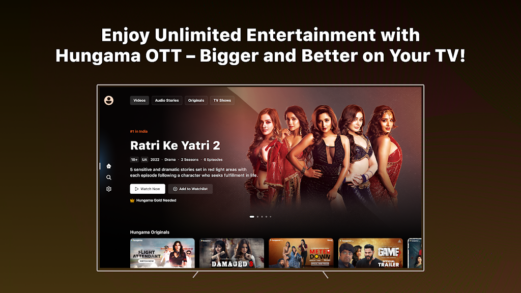 Hungama OTT is your go-to destination for endless entertainment with a wide variety of video and audio content. Whether you’re looking for thrilling originals, blockbuster movies, or engaging podcasts, we’ve got something for every mood and moment. Explore exclusive shows, popular films, and top-rated audio stories in multiple languages.
