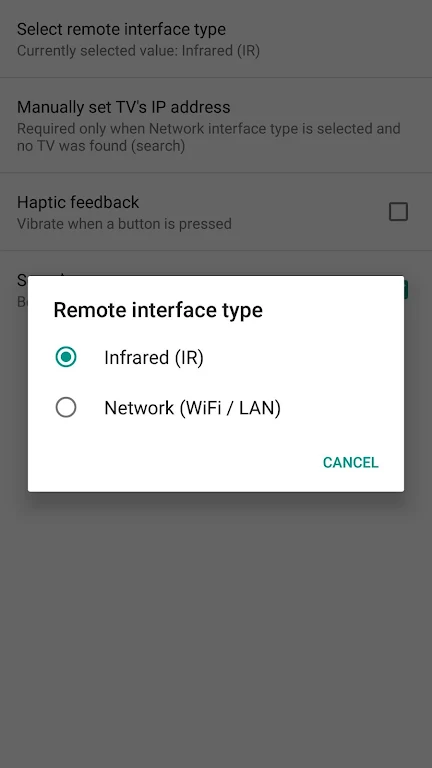 The network IP control mode allows you to use your phone as a WiFi TV remote when both devices are connected to the same local network. Compatible Sony Bravia TVs can be discovered automatically or added manually via IP address, offering a convenient smart TV remote app experience.