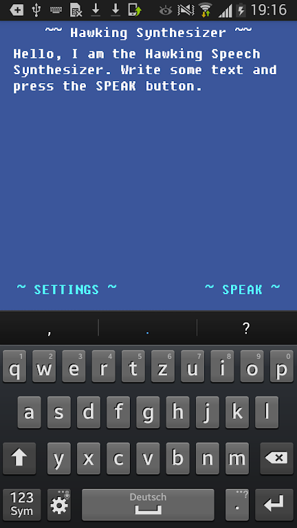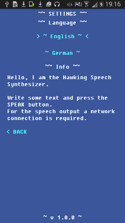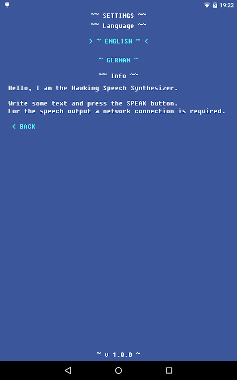 Whether you're looking to replicate the famous Hawking voice or simply enjoy a unique speech experience, this app is designed for simplicity and efficiency. Just enter your text, hit the button, and hear the voice of one of the greatest minds of our time. A network connection is required for speech output, ensuring seamless performance every time.