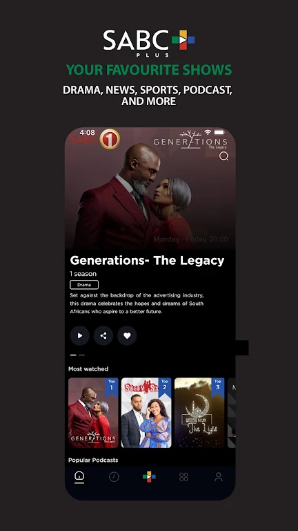 SABCPlus brings all your favorite content, including top TV shows, films, news, radio, sports, and weekday dramas, right to your fingertips! Access exclusive shows like siON on SABC 1, Belong on SABC 2, and Sisonke on SABC 3, plus enjoy live sports updates with SABC Sport. Whether you want to catch up on your favorite drama or stay up-to-date with the latest news, SABCPlus makes it easier than ever to enjoy your entertainment on-the-go.