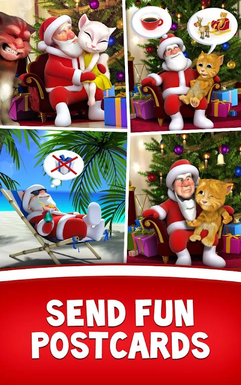 Share cute and funny Christmas cards featuring Santa, Ginger, and other Talking Tom and Friends characters—ideal for spreading cheer with a fun holiday mobile game.