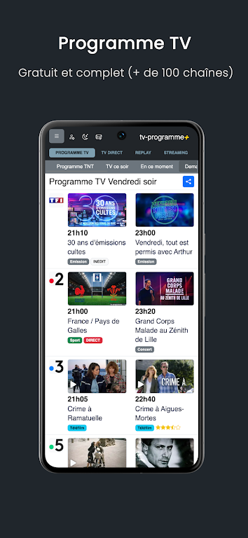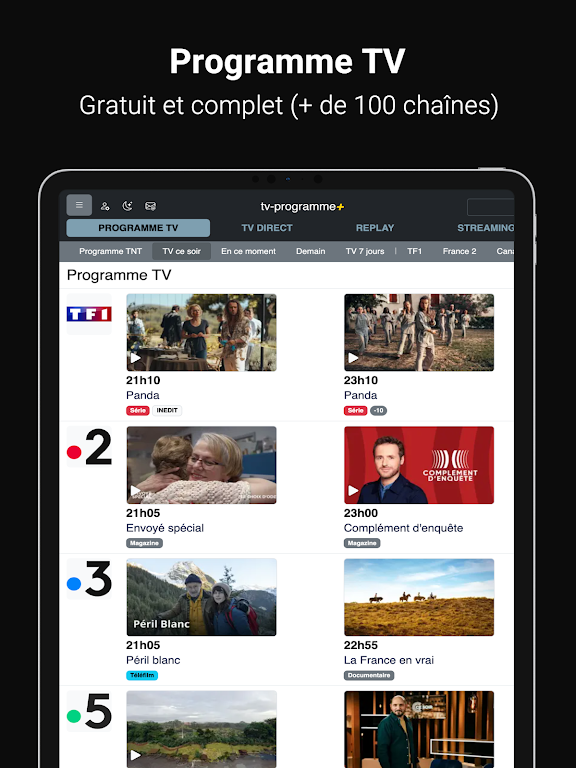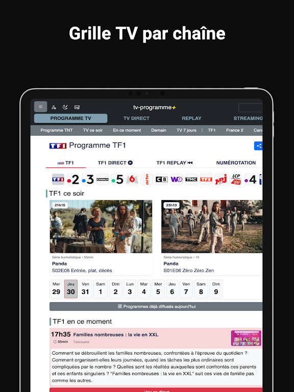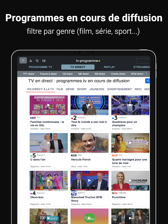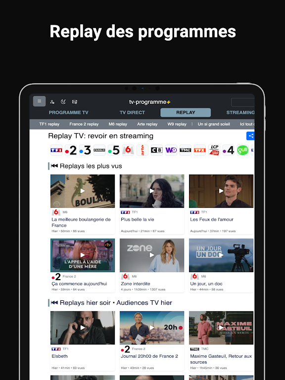 Never miss your favorite programs again with our easy-to-use interface. Browse TV schedules by time, day, or week, and instantly catch up on missed episodes via the replay feature. Plus, register for free and personalize your TV guide by selecting the channels you watch, ensuring you have access to the best content tailored to your preferences.