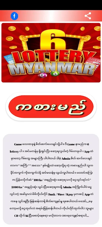 6 Lottery offers an easy and exciting gaming experience that lets you enjoy a variety of games within the app. The main attraction is the simple "big" and "small" betting game, perfect for casual players and anyone looking for quick entertainment. Bet with Myanmar currency (KS) starting from a minimum of 100 KS, or enjoy even more chances by depositing a minimum of 2000 KS. The process is straightforward, and you can easily deposit money through Bank, Wave, or Kpay, ensuring fast transactions for a hassle-free experience.