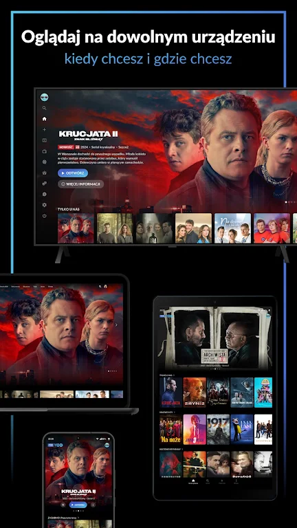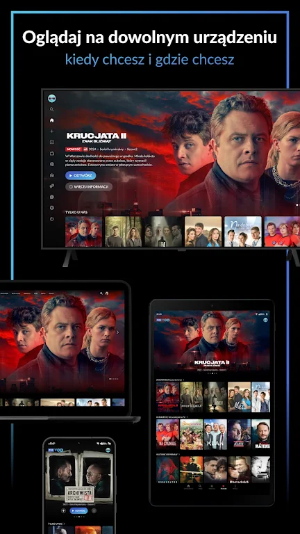 With TVP VOD, you'll get early access to popular Polish series, exclusive original productions, and the best of global cinema. Whether you're a fan of contemporary films, nostalgic for Polish TV classics, or seeking family-friendly entertainment, there's something for everyone. Watch live Polish TV channels, enjoy interactive features like custom profiles, and never miss a premiere with notifications and trailers.