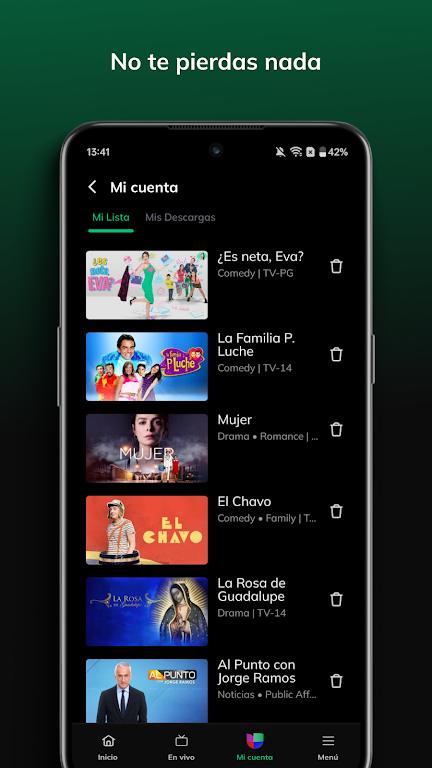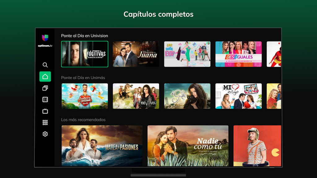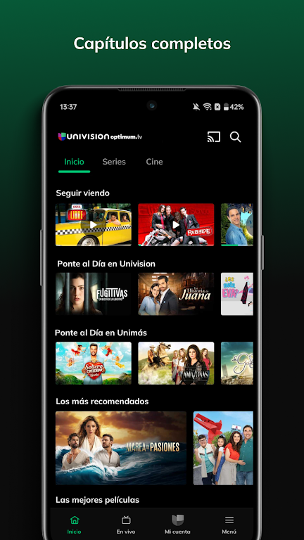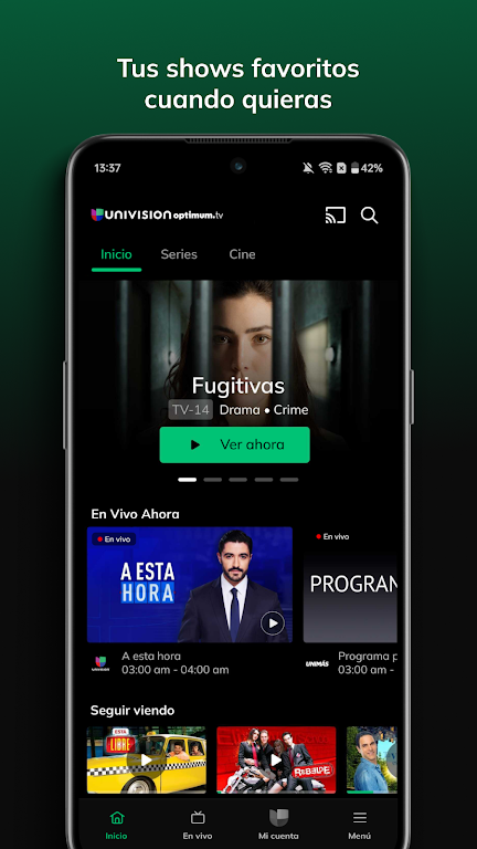 Stream all your favorite Univision and UniMás shows live or on demand, anytime and anywhere. With the Univision app, you’ll have access to live TV and exclusive content from top channels including TUDN, Galavisión, and Noticias 24/7. Whether you’re at home or on the go, enjoy an immersive entertainment experience in Spanish across all devices like Roku, Chromecast, and Apple TV.