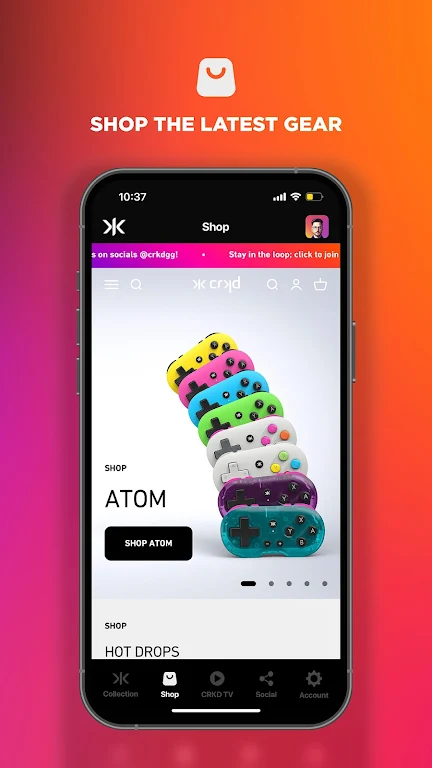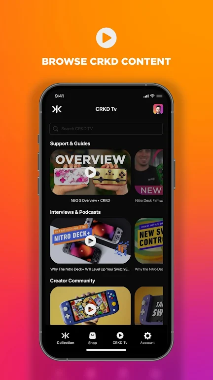 Stay connected and never miss a release! Push notifications will keep you in the loop about the latest products, limited edition items, and exclusive offers. Browse our virtual store, shop for premium gaming gear, and get it delivered directly to your doorstep with just a few taps. CRKD TV is your go-to hub for gaming guides, support videos, and all things CRKD, helping you stay at the top of your game.