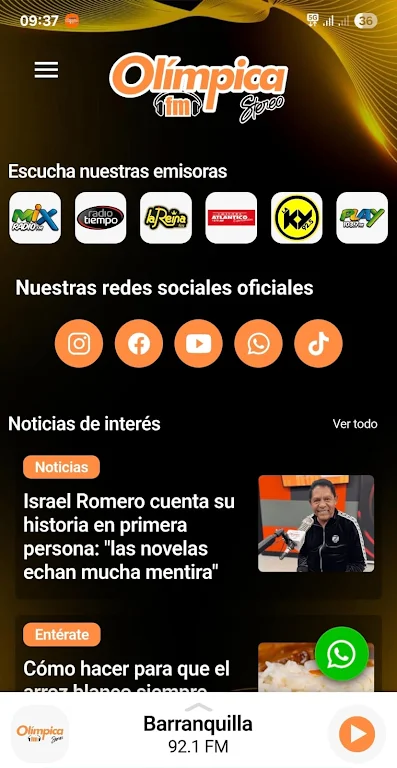 From one free live radio app in Colombia, access all stations of the Olympic Radio Organization. Switch easily between brands like Mix Radio, Radio Tiempo, Emisora Atlántico, La Reina del Vallenato, La KY 92.5 (Panama), and Play 103.7 (Panama), and enjoy the best of Colombian and Latin music radio streaming.