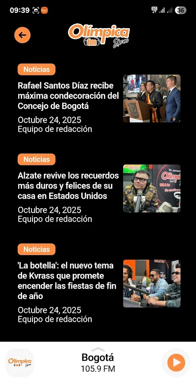 Thank you for tuning in to the live radio of Olímpica Stereo, the Colombian station that keeps you connected to the best music and entertainment 24 hours a day. Enjoy live audio streaming with our announcers, DJs, comedians, and special booth guests from every city, plus interviews with musical artists, entertainment updates, current affairs, and much more.