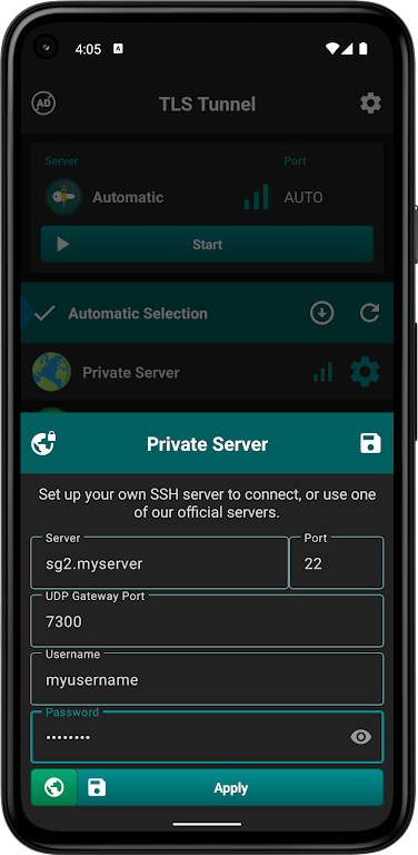 If you have your own server, you can also use the Private Server option through SSH, offering a standard connection via port 22 or using SNI and connection text for enhanced flexibility. Note that while official servers support any IPv4 protocol, SSH connections on private servers are limited to TCP. UDP access on private servers is possible only if the server supports UDP Gateway services like badvpn-udpgw, which is important for playing certain online games or using specific services. By default, communication with other users via the same server is disabled to ensure privacy and security.