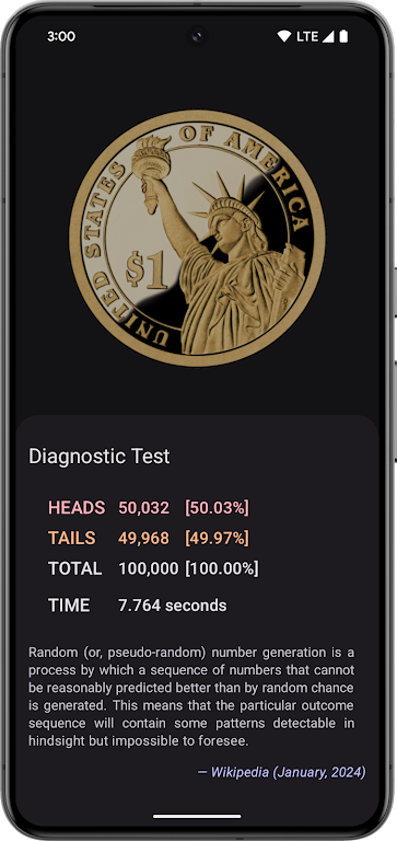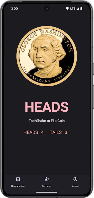 Flip the coin with a simple tap or shake, and watch the result in real-time. Curious about how random it really is? Run the built-in Diagnostic Test to flip the coin 100,000 times (or more) and verify the algorithm’s randomness. Get started with this open-source app today—perfect for anyone who loves fun, quick decisions or needs a virtual coin flip for games, surveys, and more.