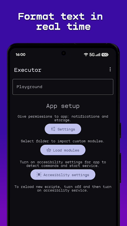 Enable the service and execute commands instantly from any text field. Just type {}> followed by your command and watch it run in real time. Enjoy a fast, seamless workflow ideal for productivity power-users, automation fans, and those searching for reliable “mobile command runner tools” or “Android automation utilities.”
