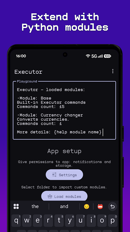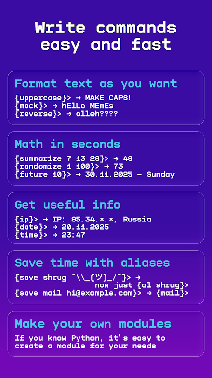 Extend the app with your own Python modules to automate tasks, process data, create new functions, and build advanced workflows. Type {help}> anytime to explore all available commands. Fully approved on Google Play and Rustore, this tool follows all platform rules and stays secure—no private data collection.