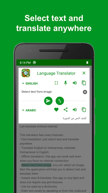 Note: To use offline translation, make sure to download the language data model. The app supports Android 4.1 and above and requires no dangerous permissions.