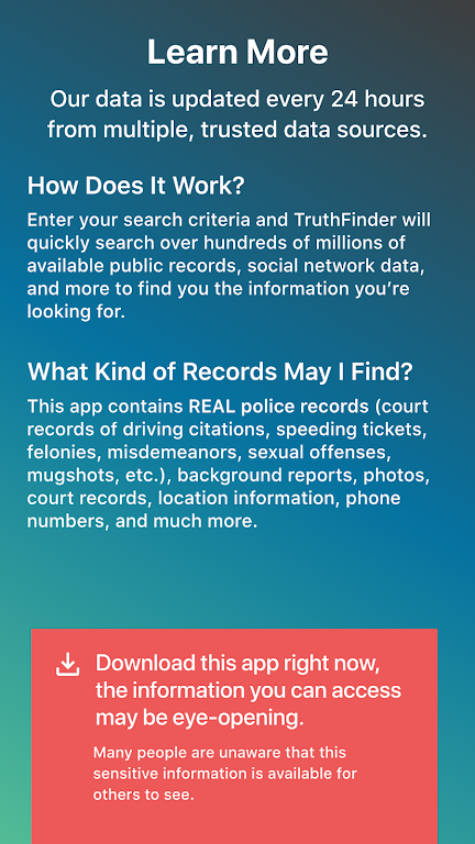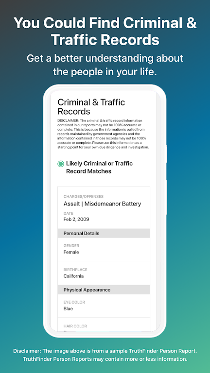With TruthFinder’s powerful app, you can quickly access a range of people search tools, including reverse phone lookup, criminal record search, public records search, and more—without ads. Whether you need to check a phone number, search for property details, or run a comprehensive background check, TruthFinder puts all the information you need right at your fingertips. Find detailed reports on people, addresses, criminal records, marriage records, and more—anytime, anywhere.