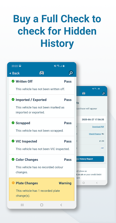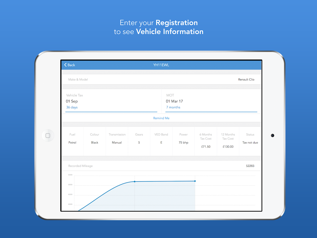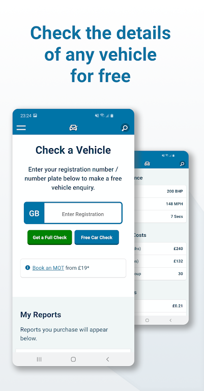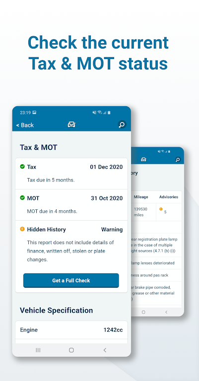 Whether you're browsing marketplaces, preparing to buy, or managing your own vehicle, the app delivers clear data and helpful alerts—including warnings for MOT or tax expiring within 30 days—to keep you informed at every step.