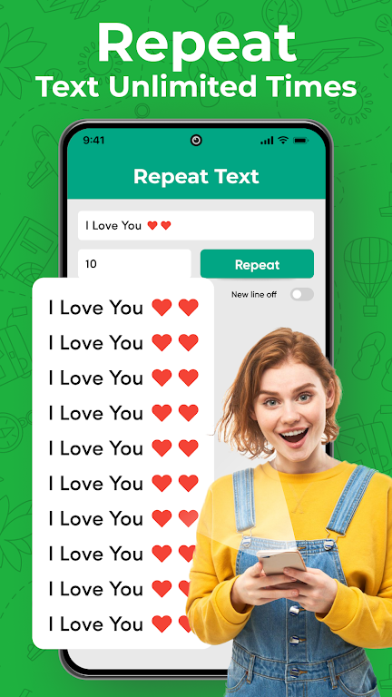 Text Repeater ToolAnnoy your friends with ease! With the Text Repeater, you can repeat any text message thousands of times with just a few taps. Send as many identical messages as you like—perfect for pranks or just for fun!
