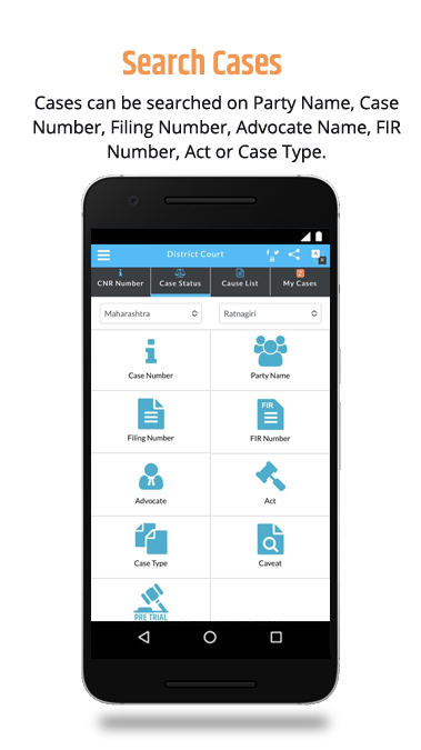Use it exclusively for District Courts, High Courts, or both—simply configure your preferred mode. Explore powerful tools like Search by CNR, Case Status, Cause List, Calendar, and My Cases, all organized with clear icons for a streamlined experience.