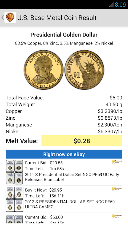 Featuring live gold and silver price updates every minute, this app lets you calculate melt values for U.S. silver coins, gold scrap, silver scrap, and base metal coins. The app integrates seamless functionality with an intuitive interface, making it the go-to solution for collectors, investors, and those wanting accurate real-time data on precious metal values.