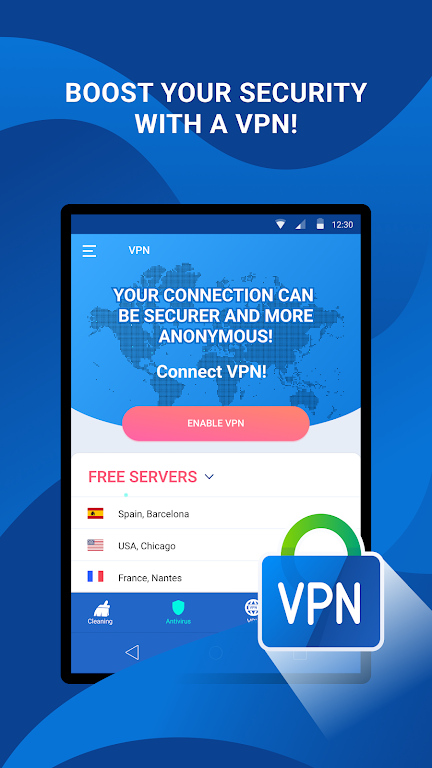 With the Cleaner Antivirus VPN, you can clean your device’s cache, clear junk files, and reclaim valuable storage space. Enjoy seamless virus protection and ensure your privacy with our advanced security features. This all-in-one cleaner app combines essential tools like a memory cleaner, junk cleaner, and antivirus software to keep your phone running smoothly and securely. Whether you're looking to optimize performance or safeguard your device from threats, this app has you covered.