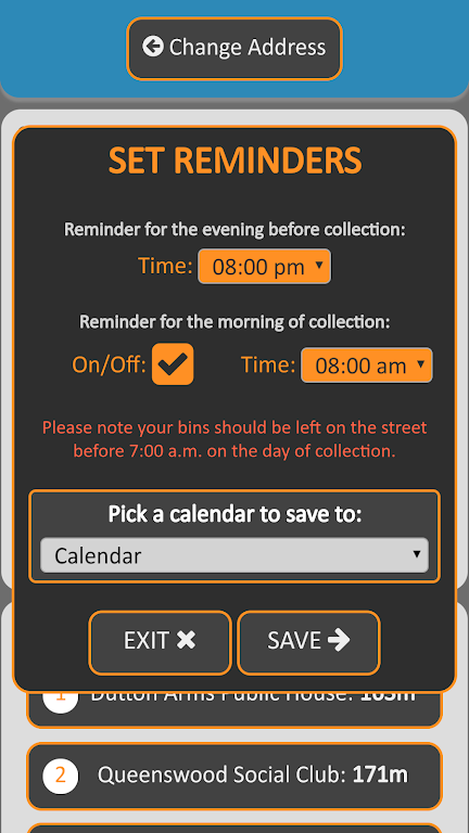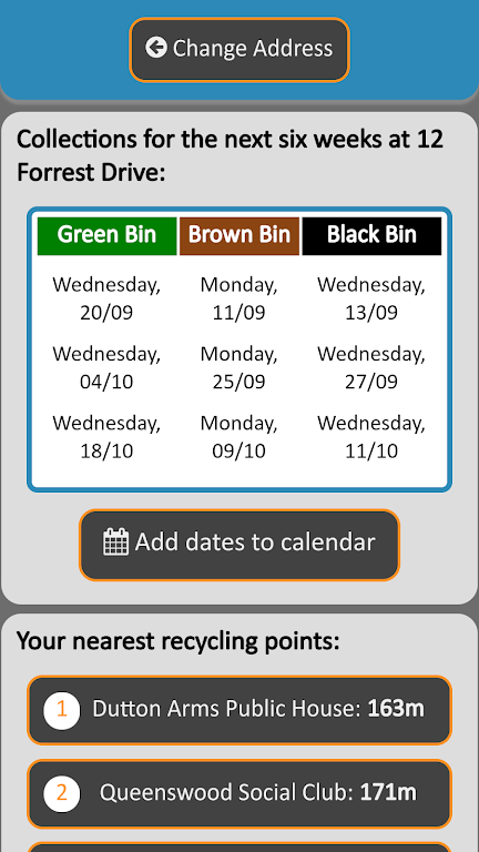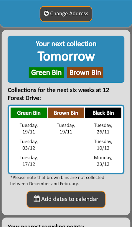 Simply enter your address and instantly view your upcoming bin collection dates. You can even save these dates to your device's calendar and set reminders to ensure you never miss a collection. Plus, find the nearest recycling points through an interactive map for added convenience. Please note that searches for bin collection dates may not be available for flats with shared bins.