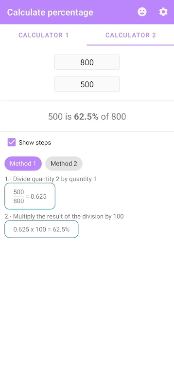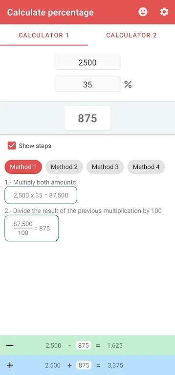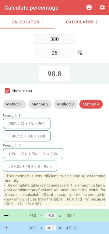 With intuitive features, this percentage calculator helps you understand percentage calculations better. You can also learn different methods of calculating percentages, both using the calculator and mentally. Download this app and improve your mathematical skills today!