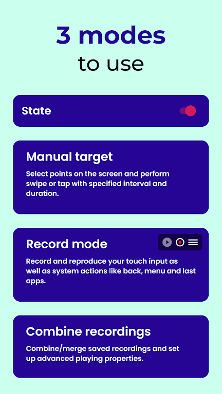Experience the easiest way to automate touch actions and create advanced workflows on your device. Unlock next-level control with Record, Combination, and Manual modes—your complete toolkit for macros, gaming, and customization.