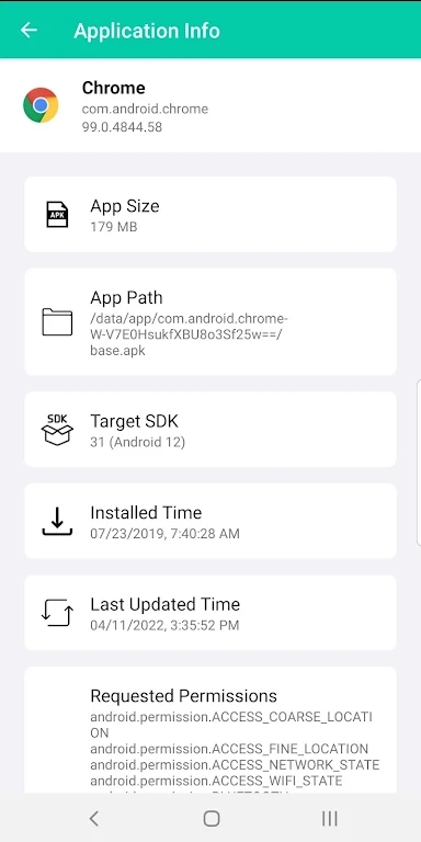 Enjoy clear app insights, including storage size, install path, permissions, and update history—all in one place.