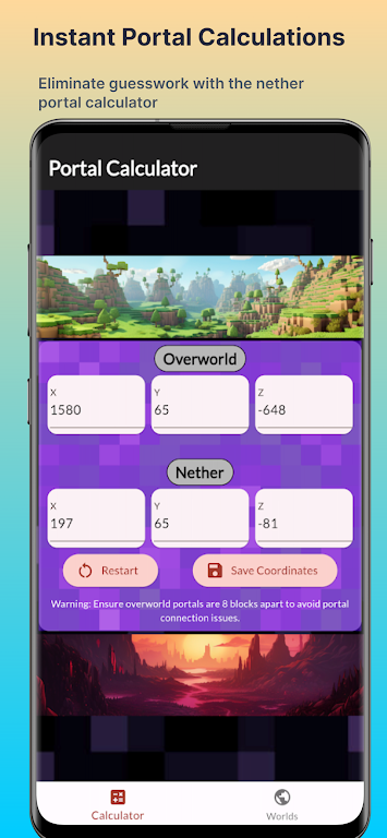 Transform your Minecraft experience with this powerful, easy-to-use tool that calculates precise Nether portal coordinates for seamless travel between the Overworld and Nether. Perfect for players in Single-player, Realms, SMP, Factions, and Anarchy servers, this app ensures you never lose track of your portals again.