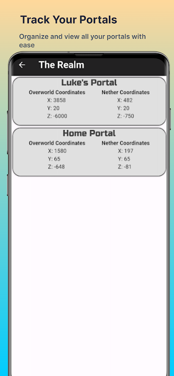 With just a few taps, input any coordinates from valid dimensions and instantly convert them to the corresponding Nether portal locations. Our tool not only makes navigation easier but also keeps your world organized and portals tracked in one place. Whether you're exploring the dangerous Nether or managing multiple portals across large worlds, this app is your ultimate Minecraft companion.