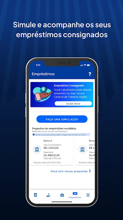In addition, workers can simulate scenarios and request loan proposals, with the option to track their loans through Credito do Trabalhador, providing a comprehensive solution for managing your career and financial well-being.