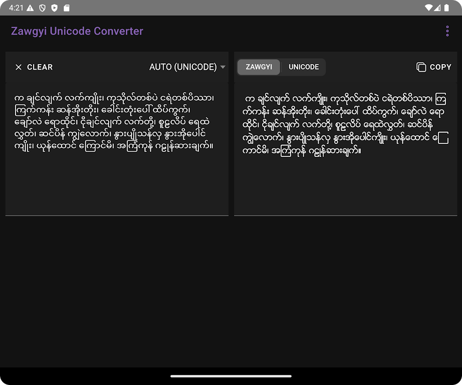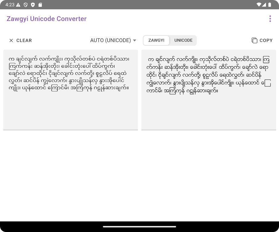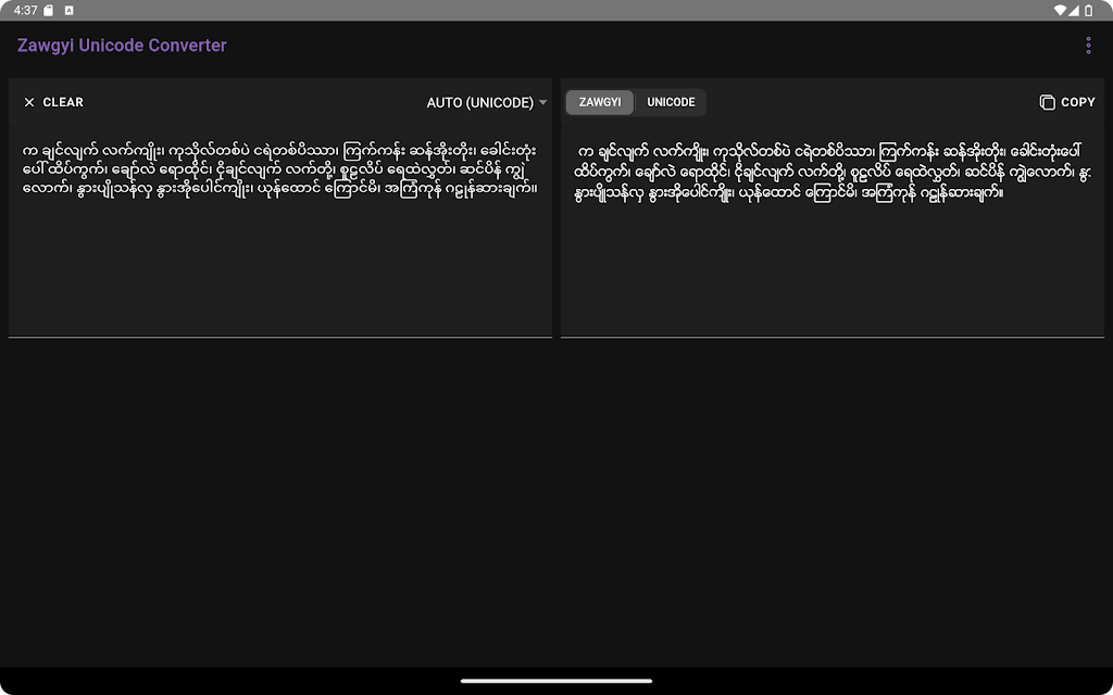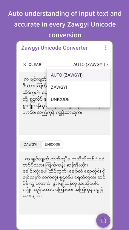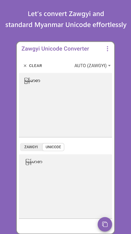 With an intelligent system that automatically detects and adapts to input encoding, you can quickly convert between Zawgyi-One and Unicode with ease. The app is tested and optimized for the Myanmar language, making it a trusted tool for users who need precise results every time.