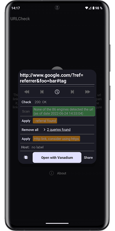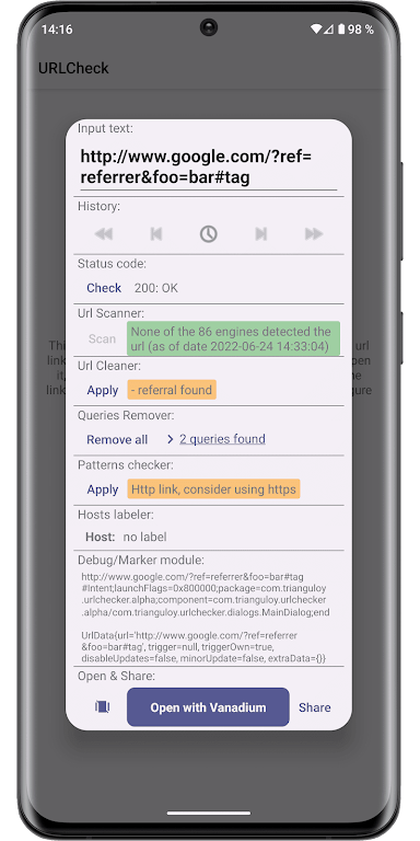URLCheck is a lightweight, open-source URL checker and cleaner app designed to enhance your browsing experience by providing quick insights and safety checks on any URL. Whether you're opening links from social networks, emails, or other apps, URLCheck ensures that you can view, edit, and analyze URLs for potential risks, security issues, and more.