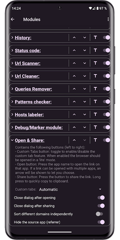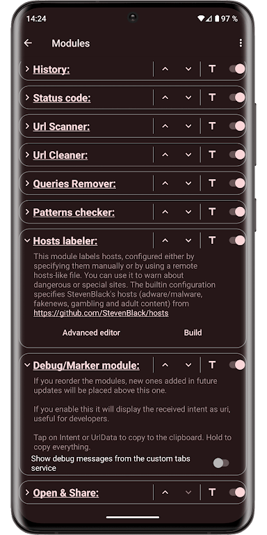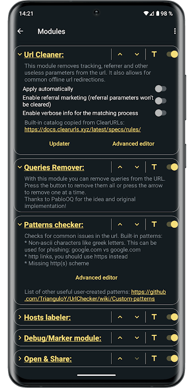 Additionally, the app includes features such as URL unshortening, query removal, regex pattern checks, and a host checker to label dangerous sites. You can also enable or disable modules and reorder them based on your preferences, ensuring the app works exactly how you want it to.