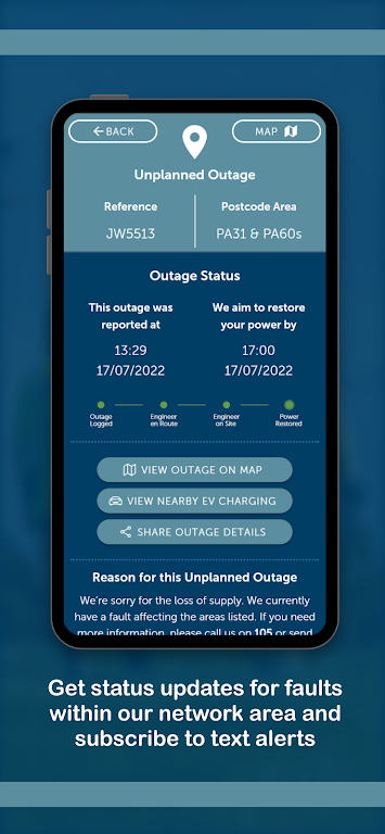 View detailed fault information, explore nearby electric vehicle charge points, and receive automatic notifications as situations change. Whether you’re checking local disruptions or monitoring broader severe-weather events, the app provides accurate insights to help you stay prepared.