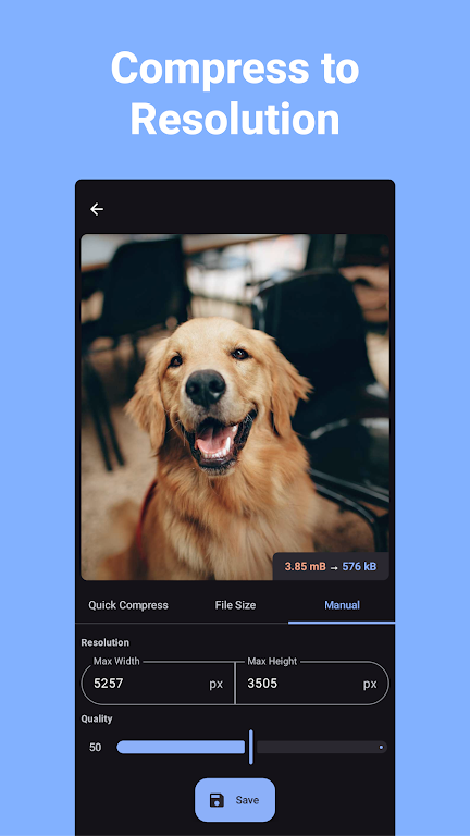 Choose from three smart compression modes—Quick Compress, Compress to a Specific File Size, or Manual Control—perfect for anyone who wants precision, speed, or both. Every mode supports batch compression and batch resizing, making this one of the best photo compressor tools for mobile users.
