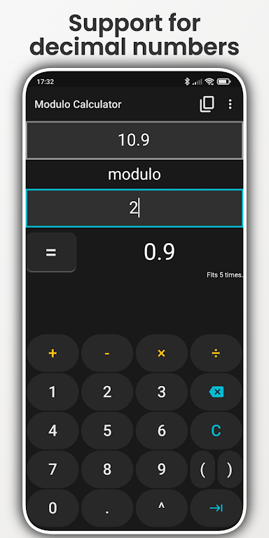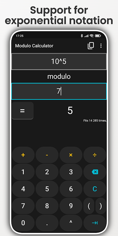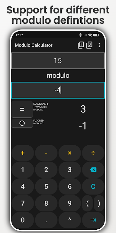 With support for various operations like addition, subtraction, multiplication, and division, as well as exponential notation, this app is an essential companion for anyone working with mathematical formulas. It also provides different modulo definitions (Euclidean, Truncated, and Floored) to help you understand how results vary based on different programming standards.