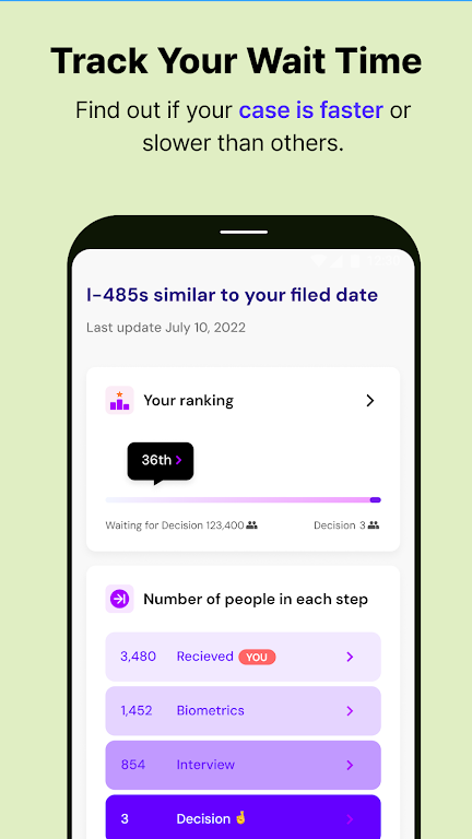 Stay informed with case processing times, approval rates, and trends based on your case type. Whether you're applying for a family-based green card or a non-immigrant visa, Lawfully keeps you updated with precise, real-time data.
