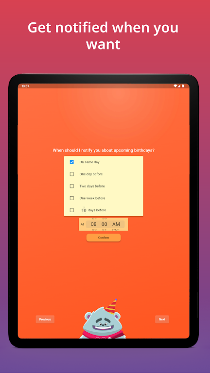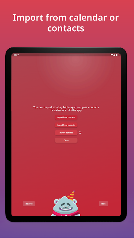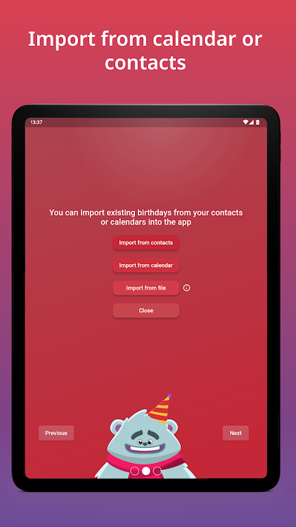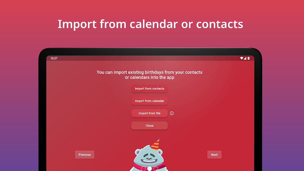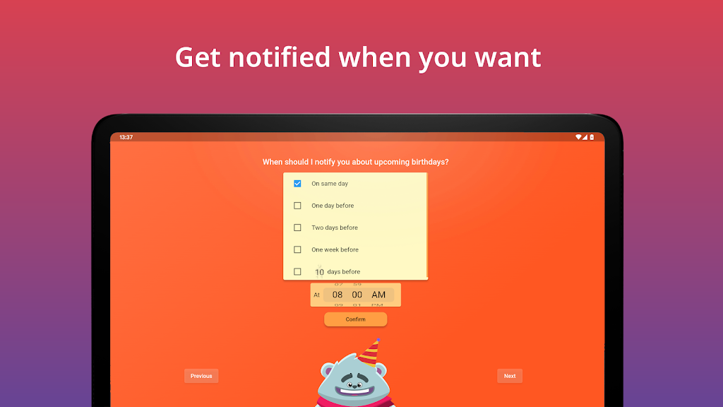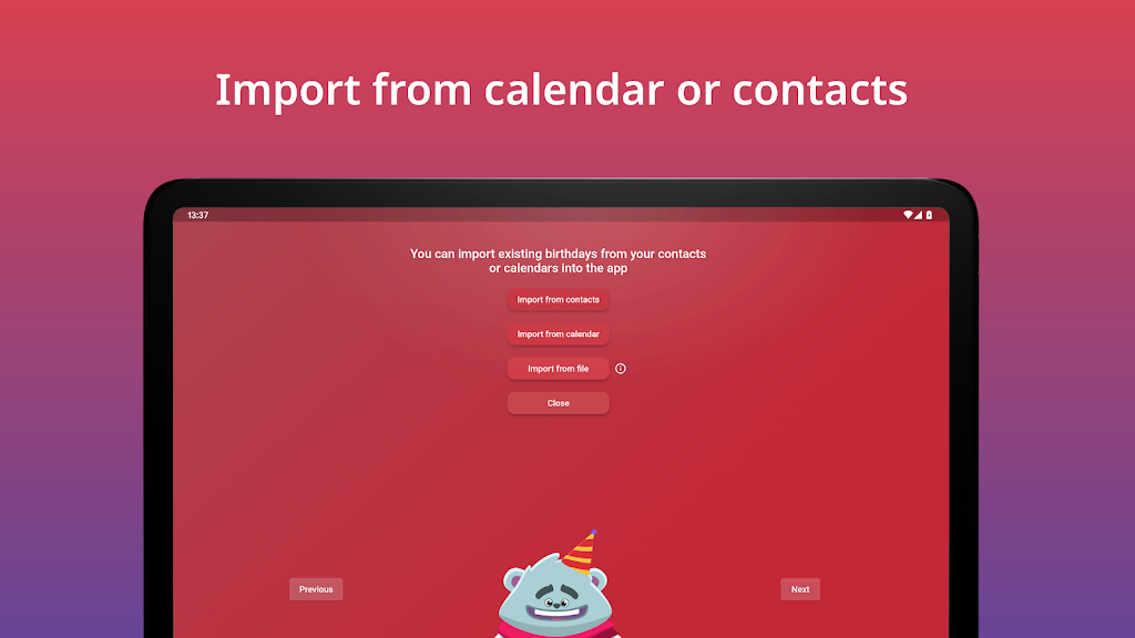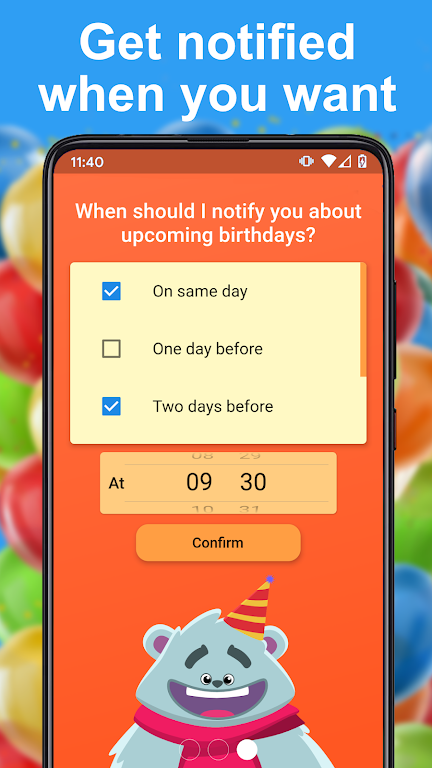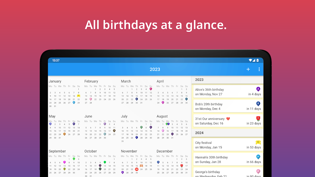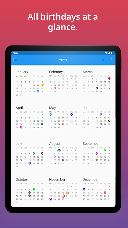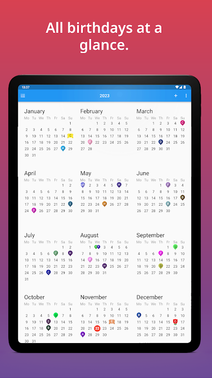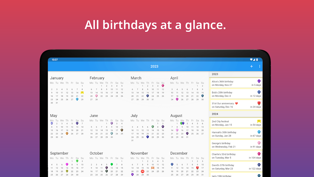 • Year View: Clean annual overview to see every birthday at a glance and plan ahead. • Reminders: Set multiple alerts days or weeks in advance, including custom times. • Widget: Check upcoming birthdays instantly from your home screen. • Import & Export: Import from contacts or Excel (.xlsx/.csv) and export to calendars or files. • Sync & Share: Synchronize with calendars and share birthdays as .ical or .csv for easy group management.App Size: 34 MBApp Version: 2.3.92