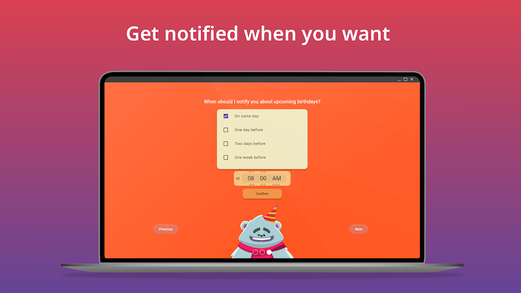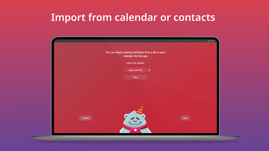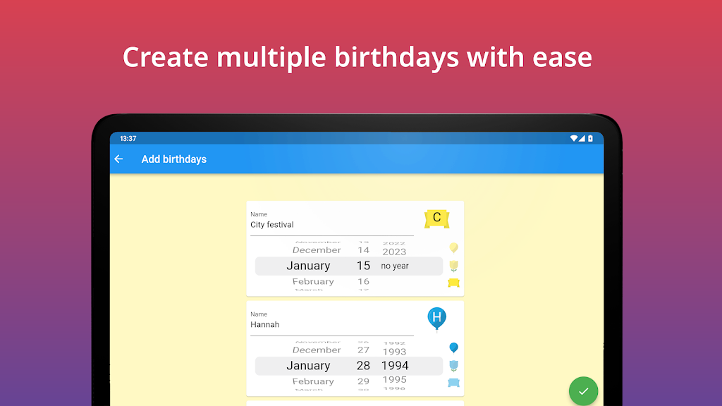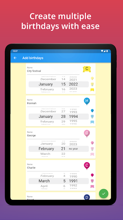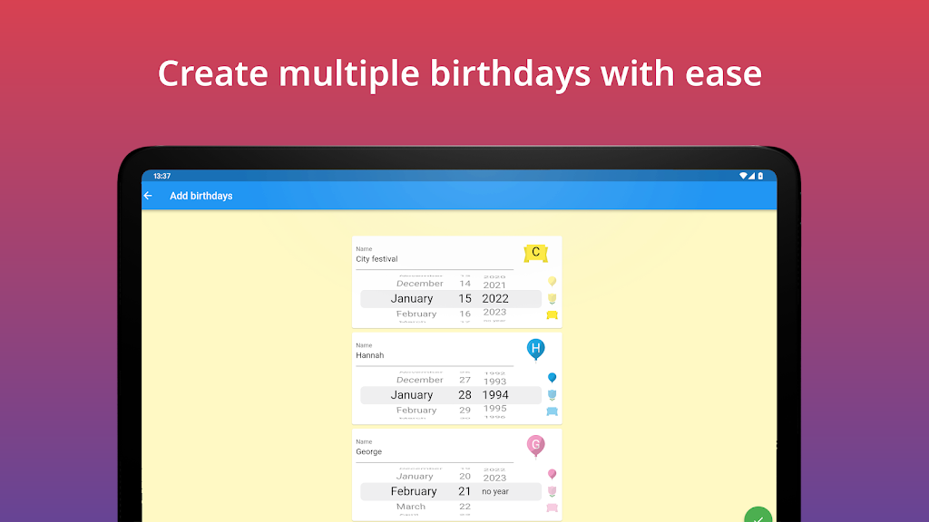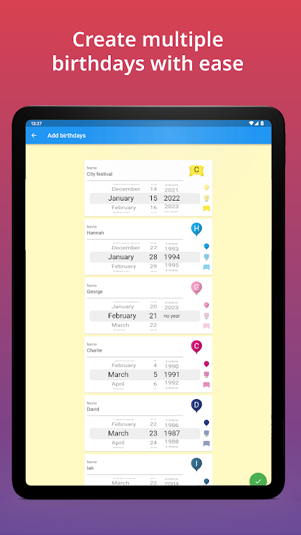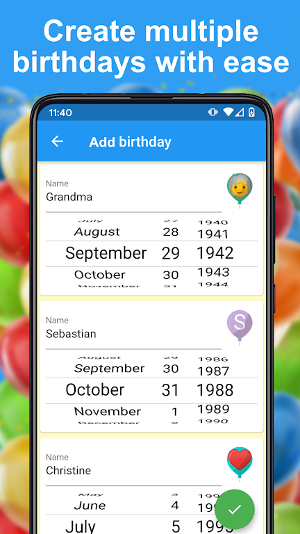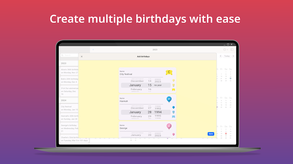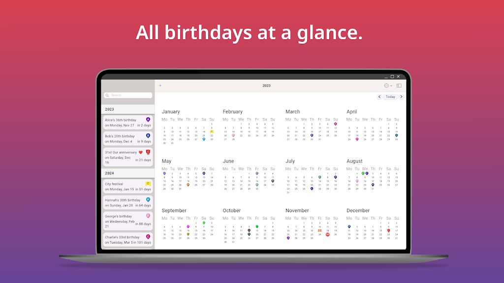 Keep all birthdays organized and never miss an important celebration again. This intuitive birthday manager gives you a clean overview, flexible reminders, and quick tools to import, export, and share events. Designed for smooth daily use, it’s perfect for families, friends, teams, and anyone who wants stress-free birthday tracking.