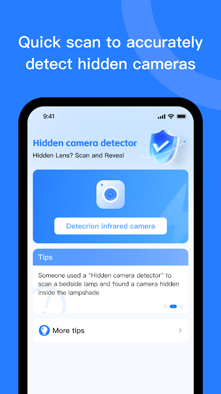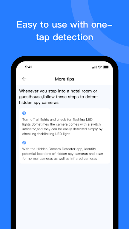 With CamFinder, you can quickly and easily scan your surroundings for hidden cameras. Its advanced detection technology ensures that you're never caught off guard, whether you're in a public space, a private area, or even at home. Stay secure and safeguard your privacy with just a few taps!