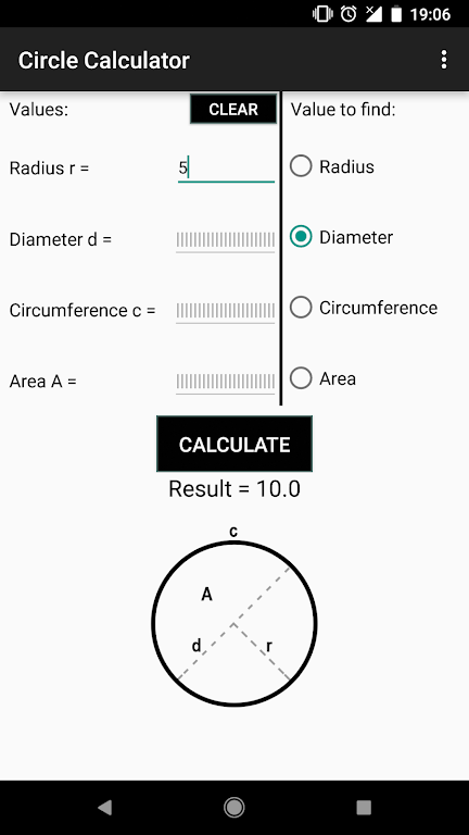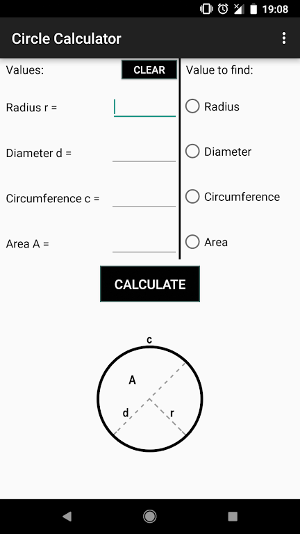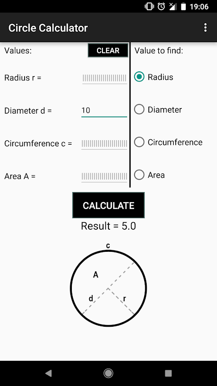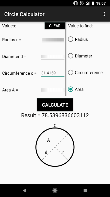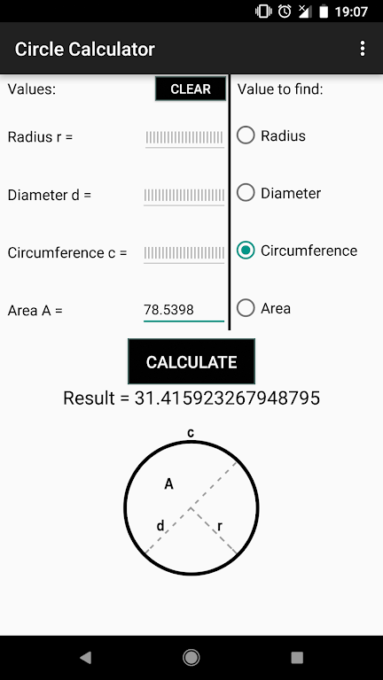 • Quickly calculate radius, diameter, circumference, or area from any known value