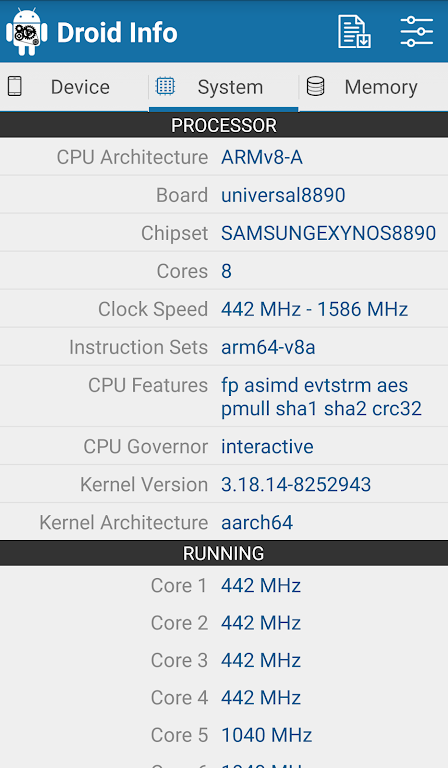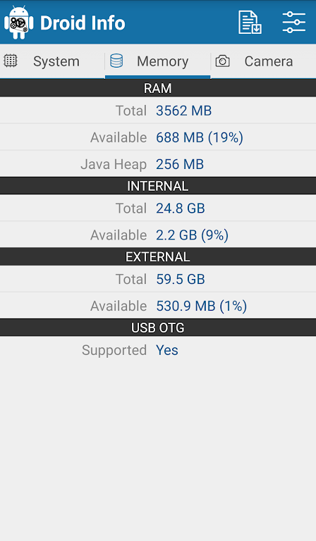 Droid Info is the perfect Android app for checking your smartphone's hardware details. Whether you're a tech enthusiast or simply curious about your device's performance, this app provides comprehensive insights into your phone's system, memory, camera, battery, and more. With Droid Info, you can quickly get detailed information and even export a full hardware report of your smartphone.